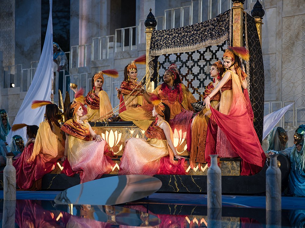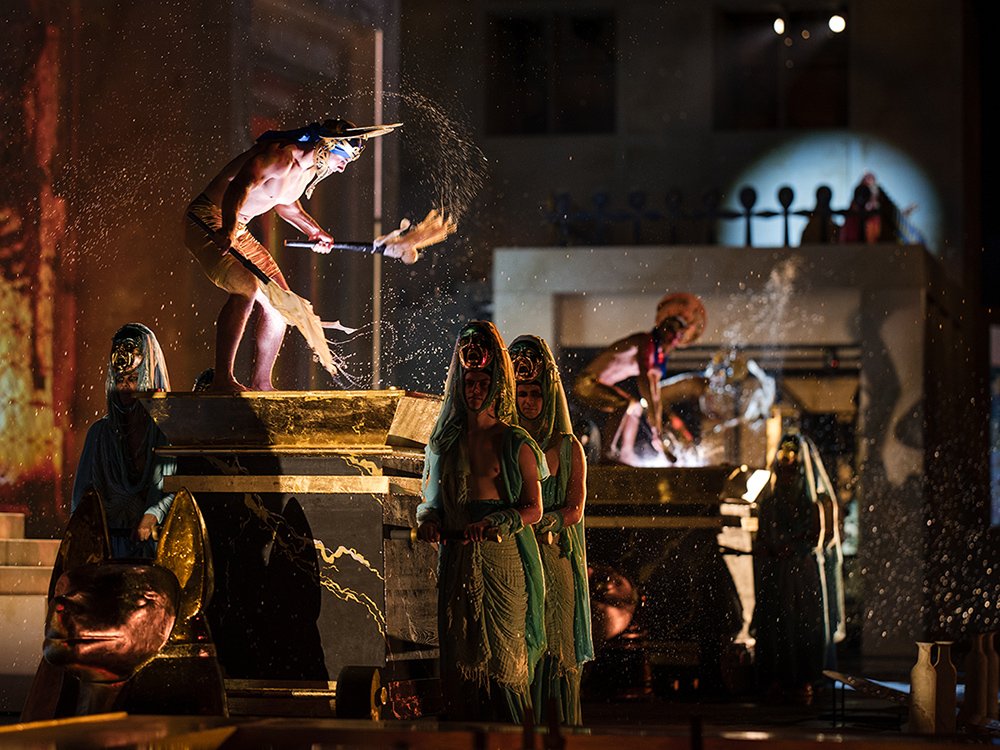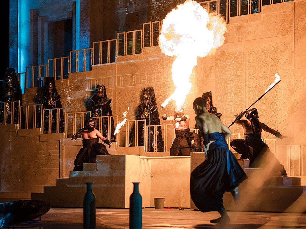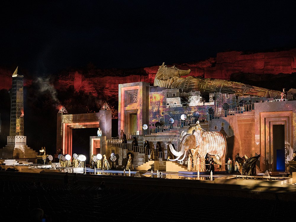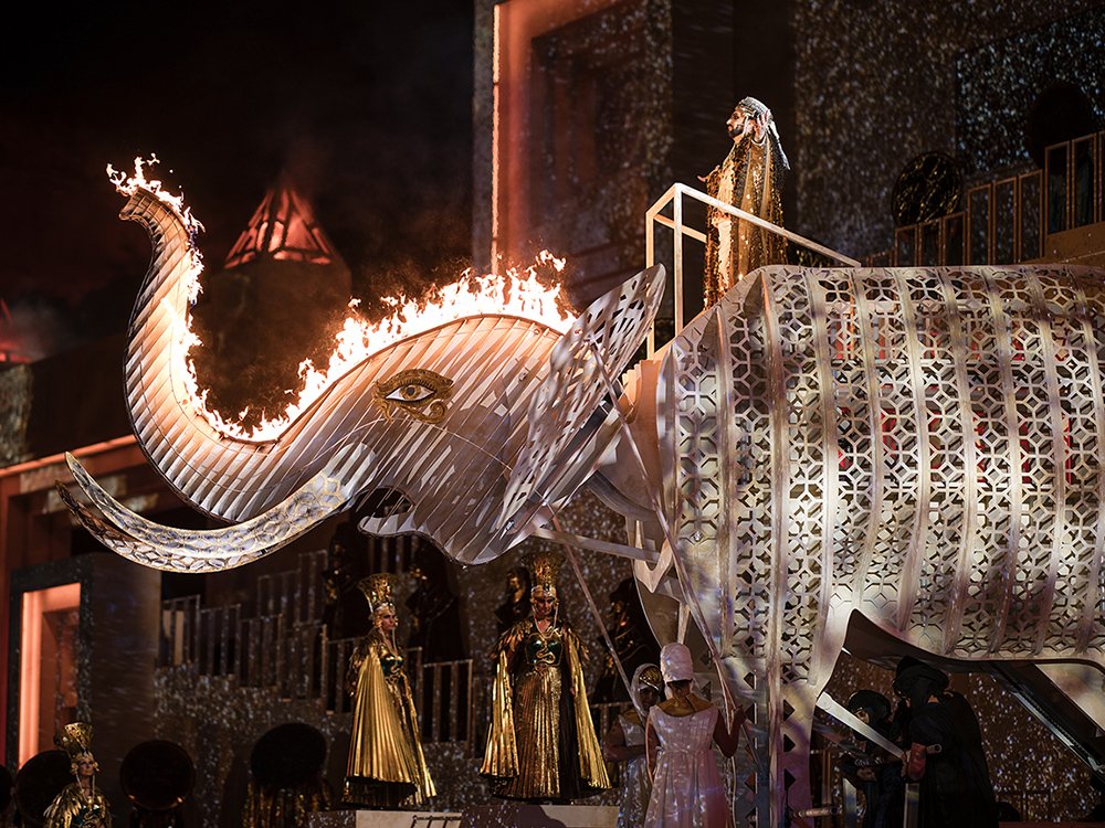 Mit „Aida“ hat Giuseppe Verdi eine große Oper über die Unsterblichkeit der Liebe geschaffen. Thaddeus Strassberger zeigt einmal mehr, dass er es wie kein anderer versteht, die rauen Felsen des Streinbruchs St. Margarethen mit einem opulenten Bühnenbild verschmelzen zu lassen. Dies besteht aus einem gigantischen Sarkophag, einem alten ägyptischen Tempel, einem riesigen Obelisken und einem fahrenden, brennenden Elefanten. Riesige Wasserbecken bilden den Grundstein für eine atemberaubende Wassershow, die zusammen mit der sensationellen Pyrotechnik einen magischen Abend erzeugen. Die Umsetzung des Bühnenbildes fand in den Werkstätten von Winter Artservice statt.