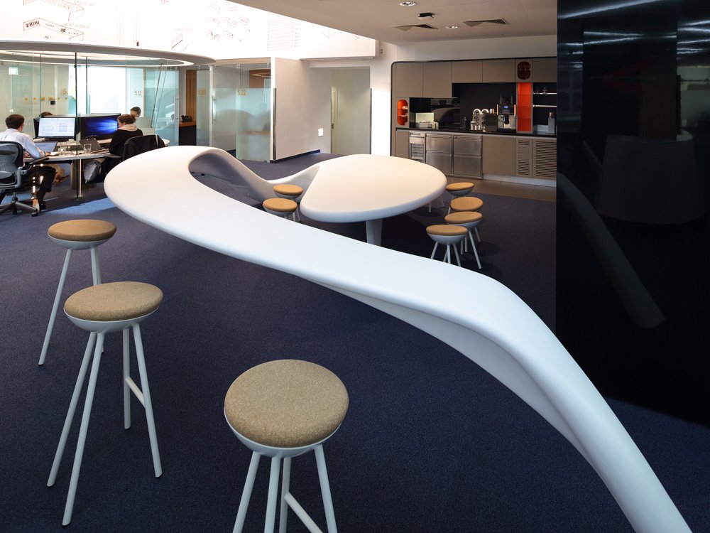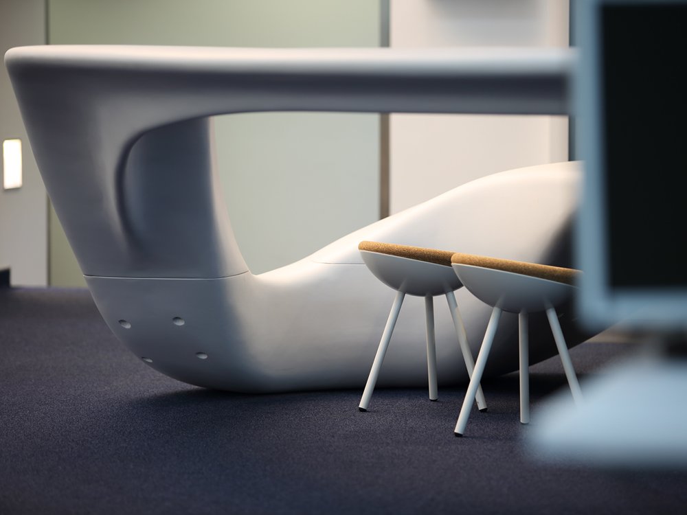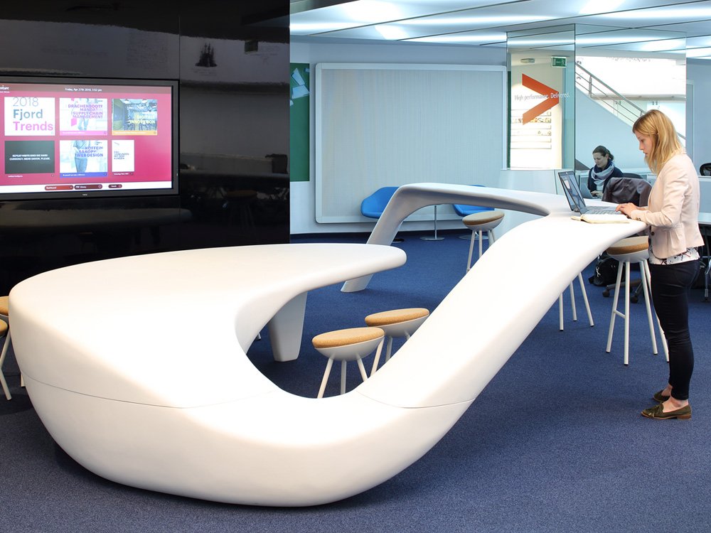 Die organisch geschwungene Form des neuesten Möbelstücks der Accenture GmbH gehört zu den interessantesten Herausforderungen der CNC Werkstatt der letzten Zeit. In seinem Design entspricht der außergewöhnliche Entwurf von architekturbox einer abstrakten Skulptur. Mehr als dreißig Einzelstücke umfassen den Metallkern, der für die nötige Stabilität sorgt. Sie wurden mit den CNC-Maschinen von Winter Artservice gefertigt und anschließend wie ein Puzzle zusammengesetzt. Das perfekte Zusammenspiel aus Planern, 3D-Modeling, CNC-Experten und Handwerkern führte zu dem unvergesslichen Coffeepoint, der seit kurzem auch die MitarbeiterInnen und KundInnen von Accenture GmbH begeistert.