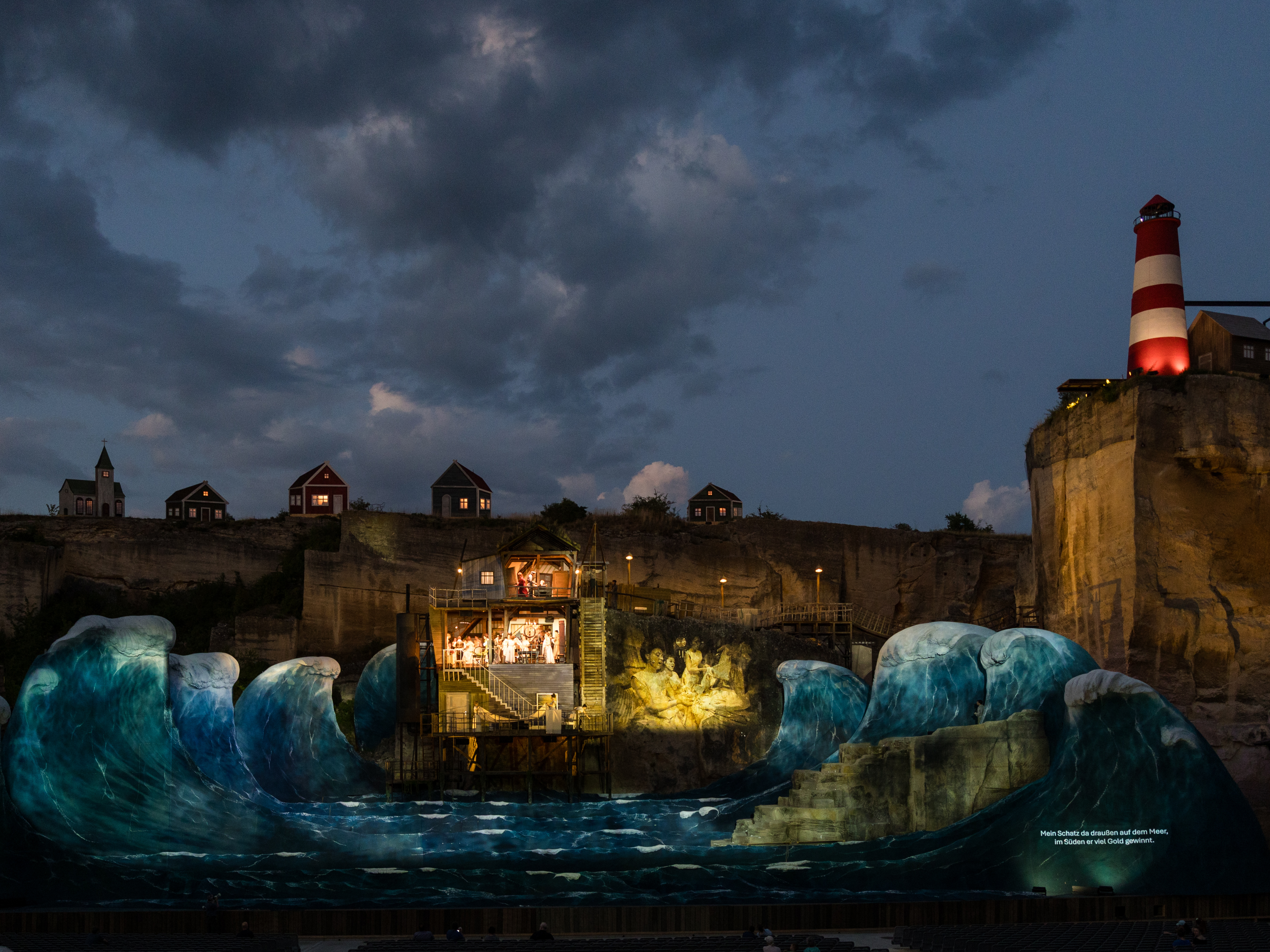 Mit „Der Fliegende Holländer“ hat Richard Wagner eine packende Oper über Sehnsucht, Erlösung und die unerbittliche Macht des Meeres geschaffen. Unter der Regie von Philipp M. Krenn wird die markante Kulisse des Steinbruchs St. Margarethen durch ein beeindruckendes Bühnenbild in Szene gesetzt, das aus einem imposanten Schiffswrack, umgeben von tosenden Wellen, sowie einer mystischen, von Nebel durchzogenen Küstenlandschaft besteht. Spektakuläre Wasser- und Lichteffekte verschmelzen mit kraftvoller Pyrotechnik, um die unheimliche Atmosphäre der Legende zum Leben zu erwecken und einen unvergesslichen Opernabend zu schaffen.