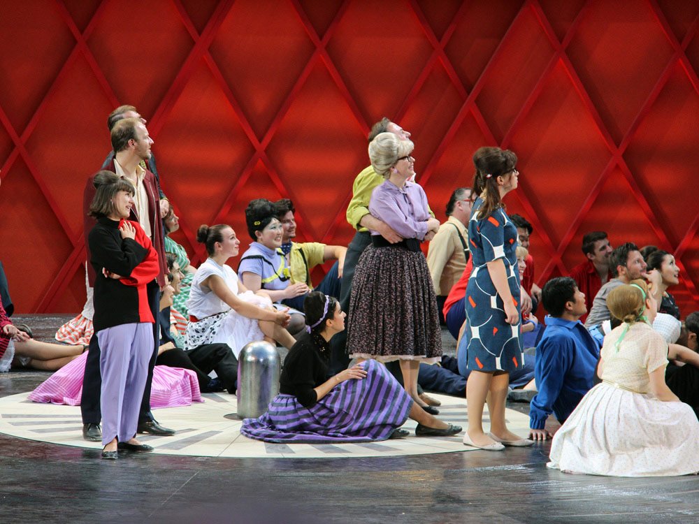 Philipp Himmelmann verlegt die romantische Komödie „Der Liebestrank“ von Gaetano Donizetti in die Fünfzigerjahre des letzten Jahrhunderts und verschafft ihr damit einen erfrischenden Ansatz. Unterstützt wird die Opera buffa durch das außergewöhnliche Bühnenbild von Raimund Bauer, das einen riesenhaften Wurlitzer darstellt. Die Handlung spielt sich meist auf dem Plattenteller ab, der sich von Zeit zu Zeit auch in Bewegung setzt. Ein umgebauter VW Bus brachte zusätzliche Dynamik in die Szenerie und wurde wie das Bühnenbild selbst in den Werkstätten von Winter Artservice gebaut. Die riesigen Einzelteile wurden im Steinbruch zu dem unvergesslichen Bühnenbild zusammengesetzt und sorgten für einen großartigen und unterhaltsamen Opernabend.