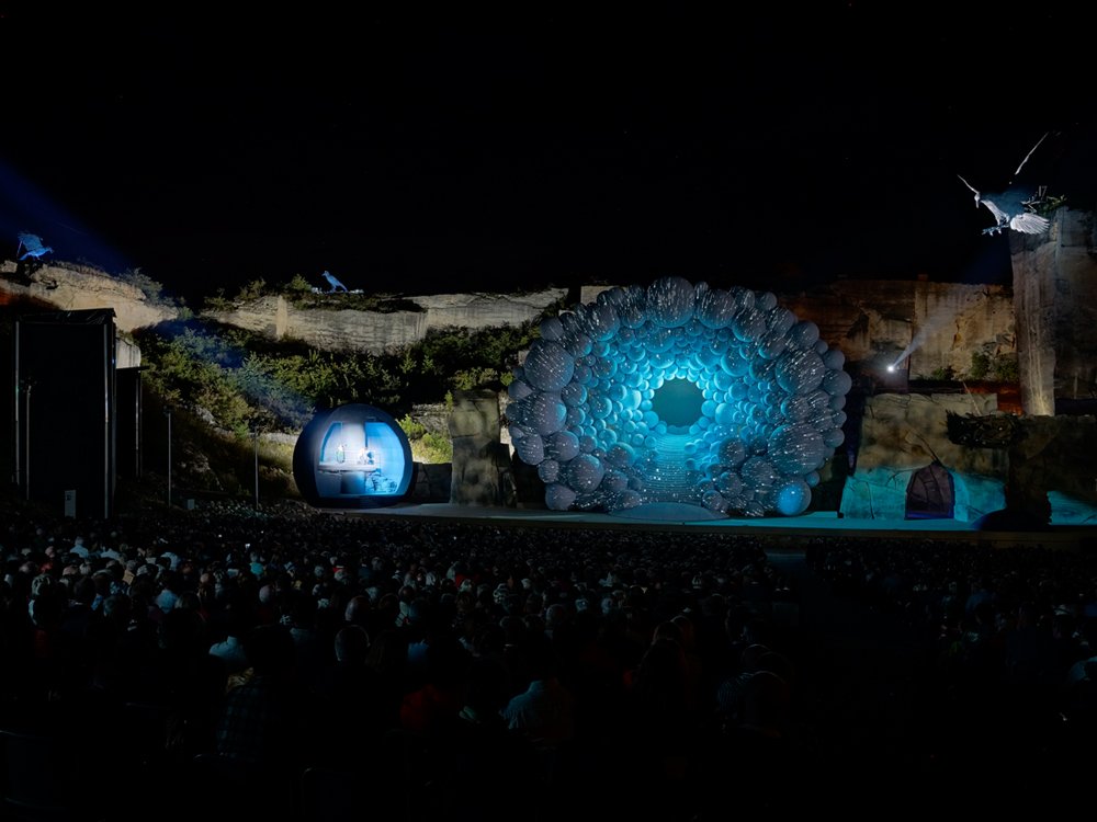 In der Saison 2019 steht mit der Zauberflöte eine der beliebtesten Opern überhaupt auf dem Spielplan der Oper im Steinbruch. Mozarts Meisterwerk fasziniert Jung und Alt auch nach über 200 Jahren seiner Uraufführung. Vor allem die virtuosen Koloraturarien der Königin der Nacht reißen heute wie damals das Publikum zu Beifallstürmen hin. Das imposante Bühnenbild von Raimund Bauer, das einen himmlischen Wolkenstrudel darstellt, verwandelt sich mittels Projektionen in unterschiedliche Universen, überwacht von einer überdimensionalen Dohle am Felsvorsprung. Winter Artservice freut sich sehr dieses äußerst beeindruckende Bühnenbild realisiert zu haben.