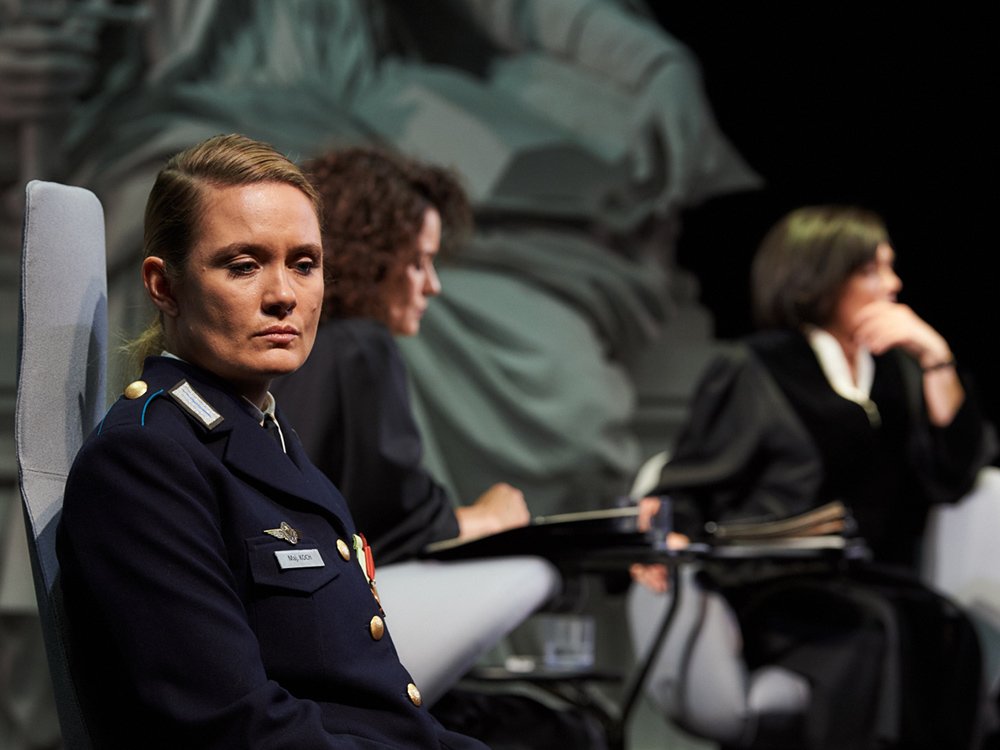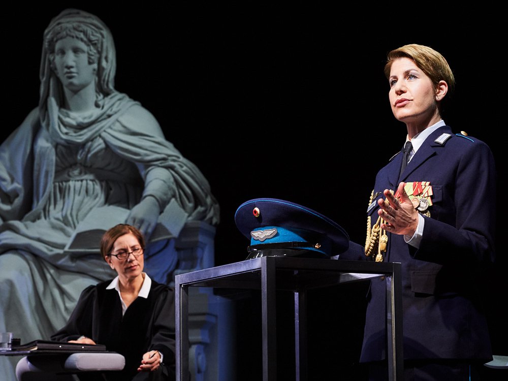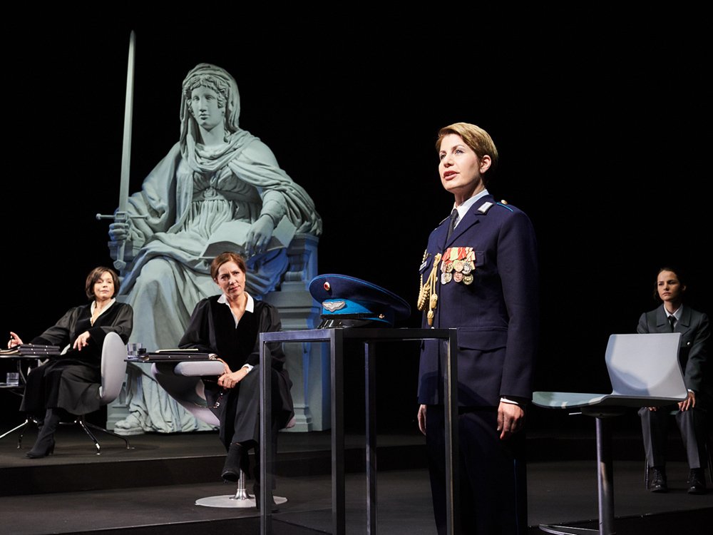 Walter Vogelweider verwandelte für „Terror“ die Bühne der Kammerspiele in einen Gerichtsaal und rückte Justitia, die Göttin der Gerechtigkeit, als mächtige Steinskulptur in ihren Mittelpunkt. Die Statue wacht mit Schwert und Waage über den Fortgang der Verhandlung und über das ausdrucksstarke Spiel des formidablen Damen-Ensembles, dass von Julian Pölsler für das Gerichtsdrama von Ferdinand von Schirach besetzt wurde.Die Skulptur entstand in den Werkstätten von Winter Artservice. Sie entspricht einer Kopie der Statue im Obersten Gerichtshof in Wien und wurde für die Inszenierung von einer Drone gescannt und später aus Styropor gefräst.